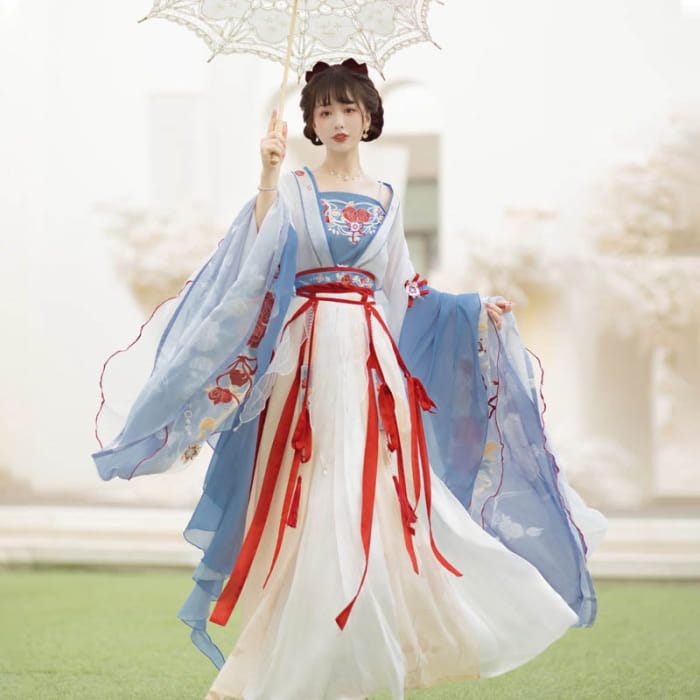 Flexible Vintage Blossom Print Cami Top Cardigan Pleated Skirt Hanfu Costume