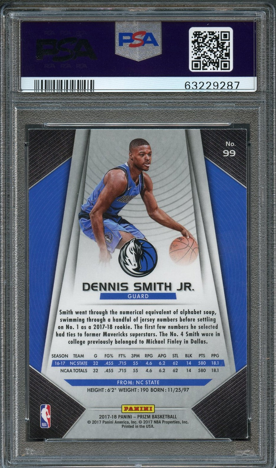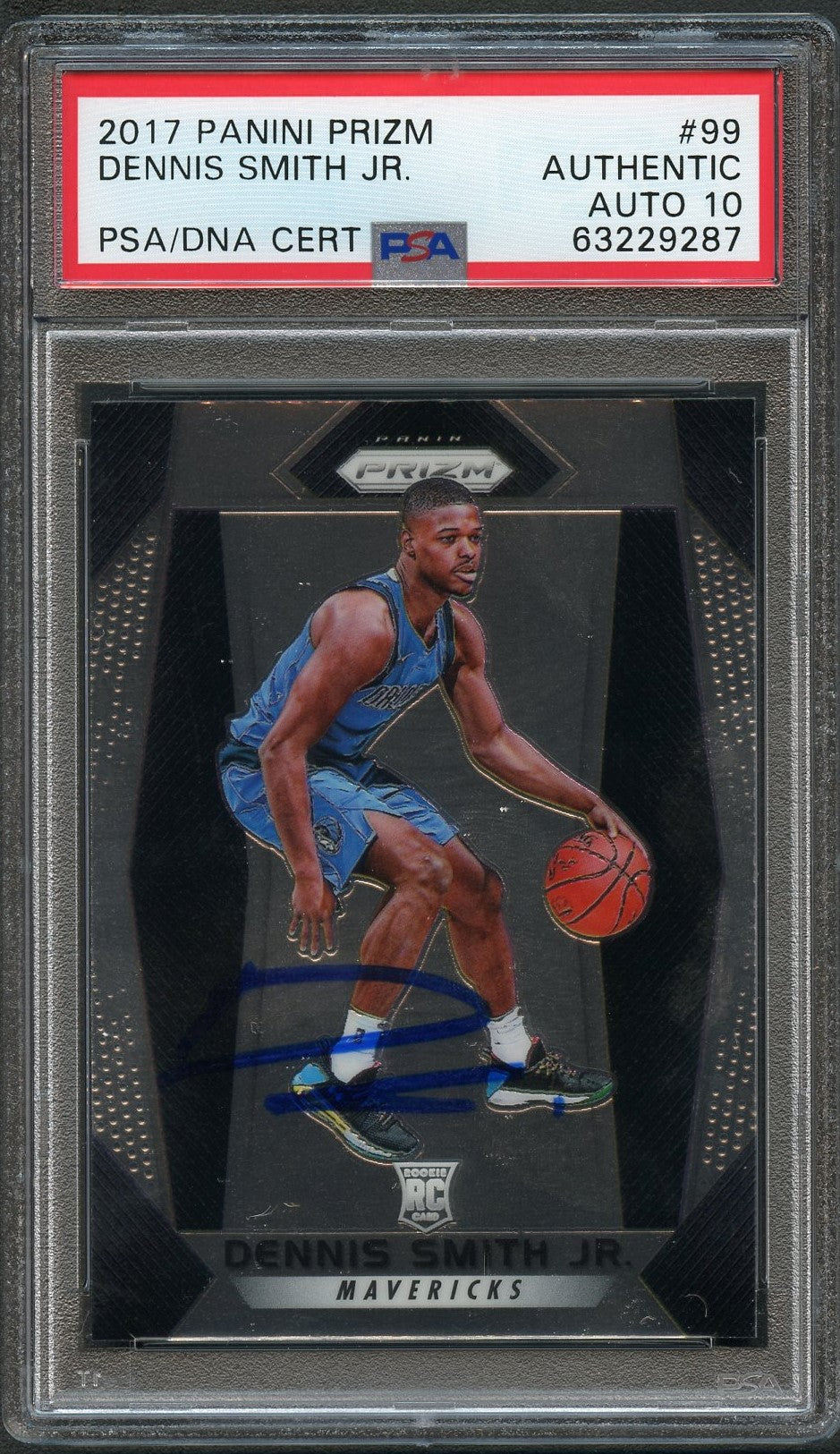 Up for sale is a 2017 Panini Prizm #99 rookie card signed by Dennis Smith Jr. of the Dallas Mavericks. The autograph of Dennis on this card was authenticated by a team of experts at PSA/DNA Authentication Services (PSA/DNA) and encapsulated so you can rest assured you are purchasing the real deal.